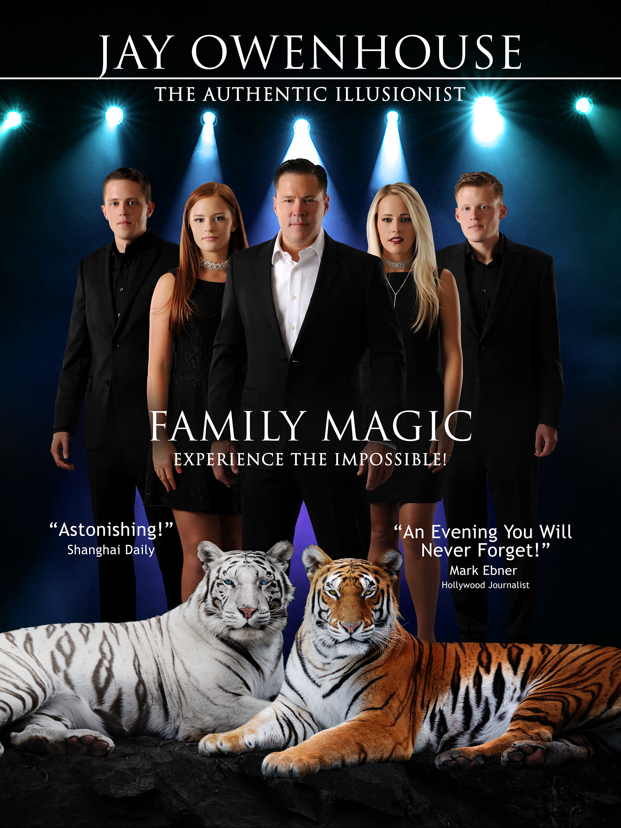 Jay has amazed millions on T.V. in “Master’s of Illusions” and ‘Magic on the Edge’. The Salt Lake Tribune calls him “Simply Amazing!” and The Tokyo Times calls the elaborate production “Truly Magic, a Must See!”. Jay welcomes you into his mysterious world of wonder and the impossible. You will experience a night of grand illusions with the most amazing magic in the world, Bengal tigers up close, dangerous escapes, and inspiring storytelling. Seeing the Owenhouse family live is an evening that will leave you breathless with a feeling of childhood wonder, and remind us all when a family works together that “anything is possible!”